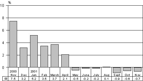 According to the seasonally adjusted trend cycle series, GDP rose slightly in November compared to October. From February to June 2001, GDP fell in comparison to the previous month. In July the fall of GDP halted. In August, September, October and November, GDP grew again compared to the previous month.