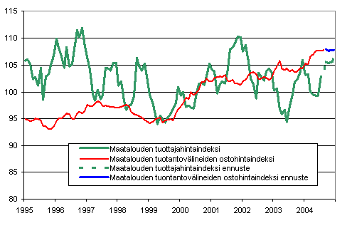 Maatalouden tuottajahintaindeksi ja maatalouden tuotantovälineiden ostohintaindeksi ovat indikaattoreita, jotka mittaavat maataloustuotteiden ja -tuotantopanosten hintakehitystä viljelijöiden näkökulmasta. Maatalouden hintaindeksien perusvuosi on 2000, jota merkitään luvulla 100. Tilastokeskus laskee maatalouden vuosihintaindeksiennusteen EU:n tilastovirastolle Eurostatille kaksi kertaa vuodessa, syyskuun ja marraskuun loppuun mennessä. Vuoden 2004 lopulliset vuosihintaindeksit valmistuvat tammi- ja maaliskuussa 2005.