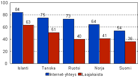 Islannissa yli 80 prosentilla kotitalouksista oli Internet-yhteys kotona, Suomessa runsaalla puolella. Laajakaista oli Islannissa kotona jo lähes kahdella kolmesta kotitaloudesta ja Tanskassa noin puolella, mutta Suomessa vain reilulla kolmasosalla.