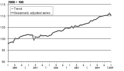 The volume of GDP rose by 1.7 per cent in January 2005 compared with the previous year's January. Of the six main industries of the Monthly Indicator only manufacturing declined slightly. In January 2005 the number of working days was equal to the corresponding month of the previous year.