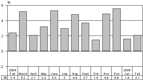 The volume of GDP rose by 2.1 per cent in February 2005 compared with the previous year's February. Of the six main industries of the Monthly Indicator only manufacturing declined slightly. In February 2005 the number of working days was equal to the corresponding month of the previous year.