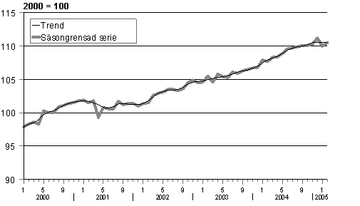 Volymen av totalproduktionen 2000-2005, trend och säsongrensad serie