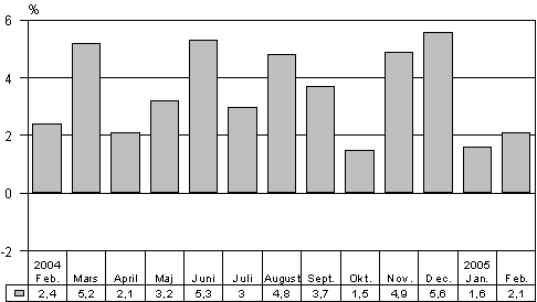 I februari 2005 ökade volymen av totalproduktionen med 2,1 procent jämfört med februari året innan. Av månadsgrafens sex huvudnäringar sjönk bara industrin något. Antalet arbetsdagar var i februari 2005 lika många som i motsvarande månad året innan.