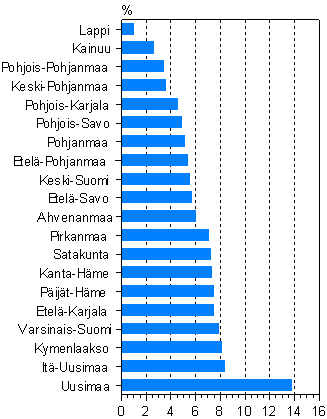 Rakennetun maan osuus maapinta-alasta maakunnittain
