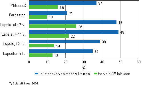 Lähes kolmasosa sekä mies- että naispalkansaajista joutuu joustamaan viikoittain työajoissaan työn tai esimiehen niin vaatiessa. Eniten työajoissa joutuvat joustamaan kuntasektorin palkansaajat sekä yksityissektorilla työskentelevät miehet. Korkeasti koulutetut joutuvat joustamaan muita enemmän, miehistä jopa neljä kymmenestä viikoittain. Muun muassa nämä tiedot käyvät ilmi Tilastokeskuksen tutkijoiden Hanna Sutelan ja Anna-Maija Lehdon työelämää käsittelevästä julkaisusta Tasa-arvo työn takana, jonka tiedot pohjautuvat vuoden 2003 työolotutkimukseen.