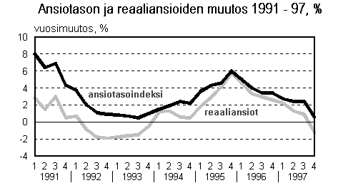 Viime vuoden loka-joulukuussa palkansaajien nimellisansiot olivat 0,6 prosenttia suuremmat kuin vuotta aiemmin. Ansioiden aiempaa hitaampi kasvu johtui maltillisista palkkaliukumista ja siitä, ettei viime vuonna ollut yleisiä sopimuskorotuksia, kun taas vuonna 1996 korotukset ajoittuivat viimeiselle neljännekselle. Kuluttajahinnat nousivat loka-joulukuusta 1996 viime vuoden loka-joulukuuhun 1,8 prosenttia, joten reaaliansiot laskivat 1,2 prosenttia. Uuden tulopoliittisen kokonaisratkaisun mukaiset sopimuskorotukset vaikuttavat ansiotason kehitykseen tämän vuoden alusta lähtien.