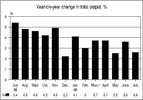 Output in construction grew by 7 per cent from July 1998. Output in trade went up by 3.1 per cent and in transport by 2.4 per cent. Other services and government services grew by 1.6 per cent.