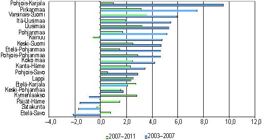 Kuvio 1. Työllisten määrän muutos (%) maakunnittain 2003-2007 ja 2007-2011*