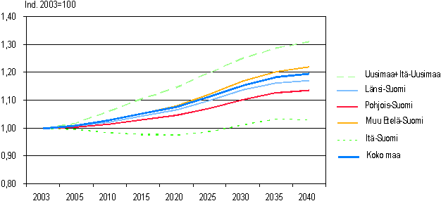 Kuvio 3. Ikääntymisen kustannukset suuralueittain 2003-2040