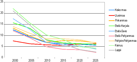 Kuvio 4. Työttömyysaste (%) maakunnittain 2000-2025