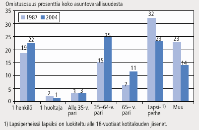 Entistä isommat ja kalliimmat asunnot ovat lisänneet kotitalouksien asuntovarallisuuden arvoa. Vaurastuminen ei johdu kuitenkaan pelkästään asuntojen hinnoista, sillä varsinkin lamavuosien jälkeen Suomessa on vaurastuttu muillakin tavoilla. Vuosina 1987-2004 oman asunnon osuus varallisuudesta on supistunut 70 prosentista 57 prosenttiin. Keskimääräistä suurempi asunnon osuus kokonaisvarallisuudesta on 30-39-vuotiailla (66 %) ja keskimääräistä pienempi 50-59-vuotiailla (50 %).