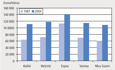 Pääkaupunkiseudulla asuvien keskimääräinen asuntovarallisuus oli 1980-luvun lopulla kolmanneksen suurempi kuin muualla maassa. Nykyisin pääkaupunkiseudun ja muun maan ero on vain noin 15 prosenttia; muu Suomi ei jää paljoakaan Helsingin ja Vantaan tasosta. Asuntovarallisuuden arvonkehitys on ollut nopeaa myös pääkaupunkiseudun ulkopuolella. Pääkaupunkiseudun alueella asuntovarallisuus jakautuu melko epätasaisesti: huipulla on Espoo päätä pidempänä kuin Helsinki ja Vantaa. Espoolaisetkaan eivät pääse kovasti karkuun, koska pidemmän aikavälin asuntovarallisuuden kasvu on ollut muuta maata verkkaisempaa (kuvio 2).