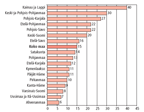 Pohjois-Suomi erottuu marjastamisessa muista maakunnista, sillä Kainuussa ja Lapissa kotitaloudet kuluttivat eniten itse poimimiaan tai saatuja metsämarjoja vuonna 2006, noin nelisenkymmentä litraa kotitaloutta kohti (kuvio 1). Seuraavaksi eniten metsämarjoja pantiin pakkaseen Keski- ja Pohjois-Pohjanmaalla, jossa syysmetsän satoa kertyi 30 litraa taloutta kohti. Pohjois-Karjalassa marjametsällä oli ehditty käymään 27 litran edestä kotitaloutta kohden.