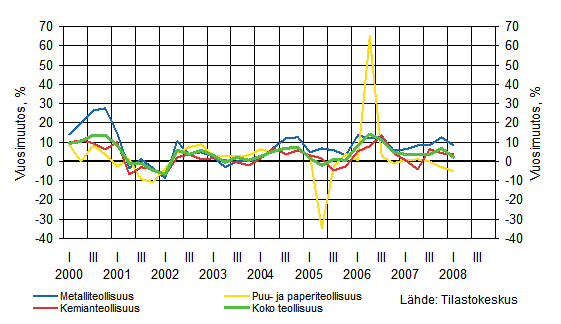 Teollisuuden keskeisillä alatoimialoilla kehitys jatkui yhä varsin erilaisena. Tuotannon kasvu jatkui metalliteollisuudessa ja kemianteollisuudessa vuoden 2008 ensimmäisellä neljänneksellä, mutta puu- ja paperiteollisuudessa tuotanto jäi selvästi vuodentakaista pienemmäksi. Liikevaihdon osalta kasvu oli erityisen nopeaa kemianteollisuudessa, jossa myös tuottajahinnat nousivat voimakkaasti. Vaikka työllisten määrä laski alkuvuodesta hieman teollisuusyrityksissä, teollisuuden palkkasumma kasvoi selkeästi.