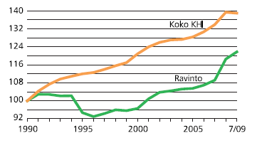 Kuvio 1. Koko kuluttajahintaindeksin (KHI) ja ravinnon kehitys 1990-2009 heinäkuu