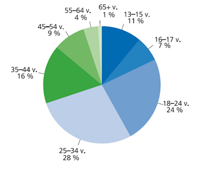 Tällä hetkellä kävijöiden määrällä mitattuna Facebook on maailman suosituin sivusto. Se on myös kiistatta Suomen suosituin yhteisöpalvelu. 1,8 miljoonaa suomalaista eli 34 prosenttia maamme väestöstä käyttää aktiivisesti Facebookia. Naisia on palvelun suomalaisissa käyttäjissä hieman enemmän kuin miehiä. Suurin ikäryhmä Facebookin suomalaisista ovat 24 - 34-vuotiaat (Kuvio 2), mutta viimeisen vuoden aikana etenkin yli 45-vuotiaiden suomalaisten määrä palvelussa on kasvanut voimakkaasti. 45 - 64-vuotiaat muodostavat jo 13 prosentin osuuden kaikista suomalaisista palvelussa.