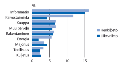 Kasvuyritysten merkitys on selvästi suurin informaatiosektorilla (Kuvio 1). Tämä selittynee osittain ajanjaksoon 2006 – 09 osuneilla yritysjärjestelyillä. Vuonna 2008 kasvuyritykset vastasivat hieman alle 10 prosentista informaatiosektorin työllisyydestä ja liikevaihdosta.