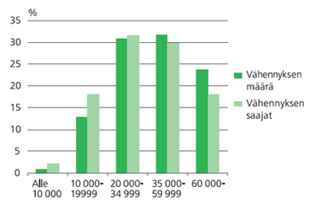 Kotitalousvähennystä käyttävät eniten keski- ja hyvätuloiset (Kuvio 1). Vähennystä käyttäneistä oli vuonna 2009 lähes viidennes vähintään 60 000 euroa ansaitsevia ja vähennyksen määrästä heille kohdentui lähes neljännes. Lähes kolmannes tästä ryhmästä oli käyttänyt verovähennystä. 20 000–35 000 euroa ansaitsevista näin oli tehnyt vain kahdeksan prosenttia; ryhmän suuruuden vuoksi heitä oli kuitenkin vähennyksen saajista lähes kolmannes, kuten kuviosta 1 ilmenee.