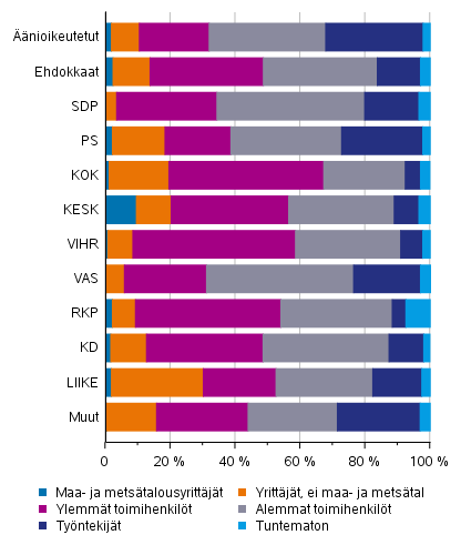Ehdokkaissa on enemmän yrittäjiä (ml. maa- ja metsätalousyrittäjät) kuin äänioikeutetuissa. Yrittäjien osuus työllisistä ehdokkaista on noin 14 prosenttia ja äänioikeutetuista hieman yli 10 prosenttia. Eduskuntapuolueista eniten yrittäjiä on ehdokkaana Liike Nyt -puolueella (30,2 %) ja toiseksi eniten Keskustalla (20,2 %), joista noin puolet on maa- ja metsätalousyrittäjiä.