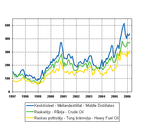 Kuvio 07. Öljyn tuontihinnat 1997-, €/t