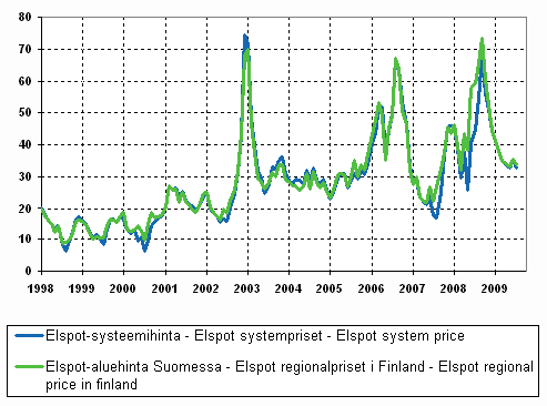 Figur 12. Månadsmedelvärdena för spot-priserna vid elbörsen Nord Pool 1998-, €/MWh