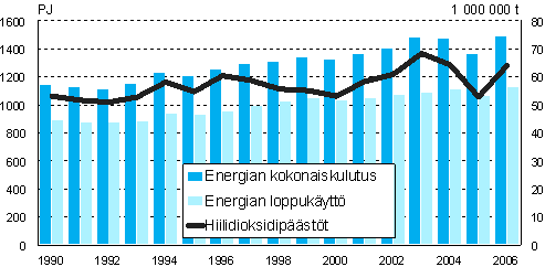 Primäärienergian kokonaiskulutus oli Tilastokeskuksen tietojen mukaan 1 492 petajoulea vuonna 2006, mikä oli 9 prosenttia enemmän kuin edellisvuonna. Sähköä käytettiin 90 TWh eli yli 6 prosenttia enemmän kuin vuonna 2005. Energian tuotannon ja käytön hiilidioksidipäästöt nousivat 21 prosenttia verrattuna edellisvuoteen.