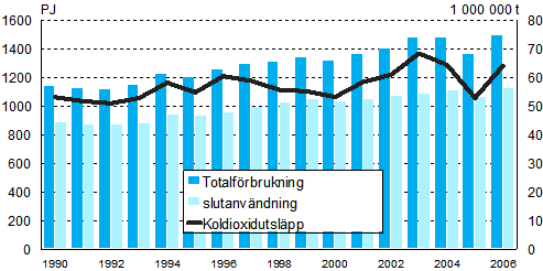 Enligt Statistikcentralens uppgifter var totalförbrukningen av primärenergi 1 492 petajoule år 2006, dvs. 9 procent mer än året innan. Elförbrukningen uppgick till 90 TWh, vilket var över 6 procent mer än år 2005. Koldioxidutsläppen vid energiproduktionen och -förbrukningen ökade med 21 procent jämfört med året innan.