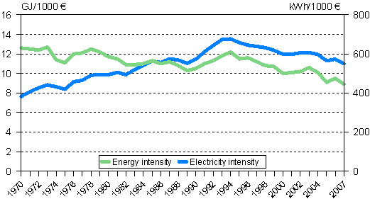 Energy and electricity intensity 1970-2007