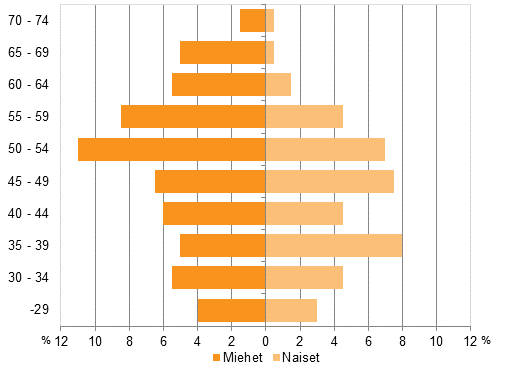 | Miehet | 100,0 | 42,2 | 2,6 | 30,2 | 18,1 | 5,2 | 1,7 |