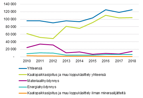 Jätteiden käsittelymäärät seurasivat jätemäärän kasvua. Suurin osa käsiteltävästä jätteestä oli kaivosalueille läjitettävää mineraalijätettä, vaikkakin niitä hyödynnettiin myös materiaalina aiempia vuosia enemmän – 14,5 miljoonaa tonnia. Mineraalijätettä voidaan hyödyntää muun muassa maanrakentamisessa.