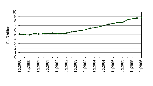 The EMU debt of local government, that is municipalities and joint-municipal authorities, remained almost unchanged from the second quarter. Local government debt has been growing slowly from EUR 5 billion in 2000 to nearly EUR 9 billion in the third quarter of 2006. The low level of social security funds' debt according to the EMU criteria has, for its part, dropped to almost zero during the past few years.