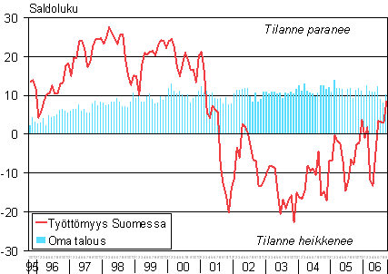 Kuluttajien odotukset työttömyydestä Suomessa ja omasta taloudestaan vuoden kuluttua 10/1995-9/2006