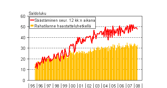 A2 Kuluttajien arviot kotitaloutensa säästämismahdollisuuksista seuraavan 12 kk aikana ja rahatilanteesta haastatteluhetkellä 10/1995 - 5/2008