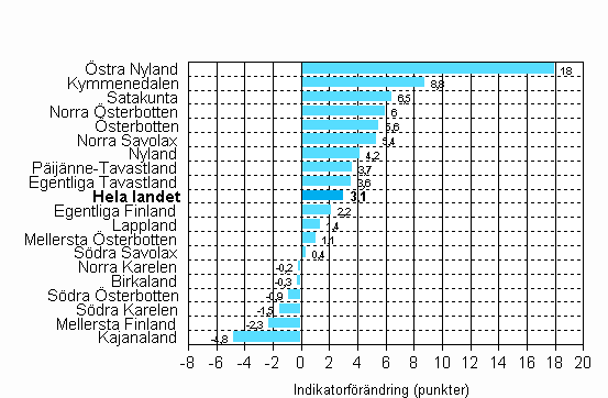 Förtroendet för ekonomin förbättrades i de flesta landskapen jämfört med föregående kvartal. I hela landet gick förtroendet i genomsnitt 3,1 punkter uppåt. Förtroendet steg mest i Östra Nyland (18 punkter) och i Kymmenedalen (9 punkter). I några landskap blev inställningarna svagare; i Kajanaland med fem punkter, i Mellersta Finland och Södra Karelen med ett par punkter och i Södra Österbotten med en punkt. Nästan oförändrade var inställningarna i Birkaland, Norra Karelen och Södra Savolax.