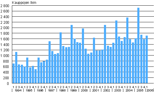 Omakotitalotonttien kauppojen lukumäärät 1994/1-2006/1
