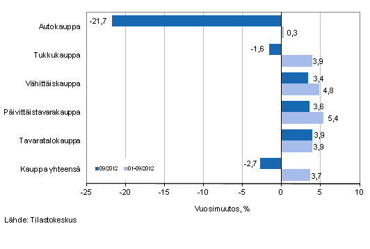 Tilastokeskuksen mukaan vähittäiskaupan myynti kasvoi syyskuussa 3,4 prosenttia vuoden 2011 syyskuusta. Myynnin määrä, josta hintojen vaikutus on poistettu, laski vähittäiskaupassa samana aikana 0,6 prosenttia. Päivittäistavarakaupassa myynti kasvoi 3,6 prosenttia ja tavaratalokaupassa 3,9 prosenttia edellisvuoden vastaavasta ajankohdasta. Sen sijaan tukkukaupassa myynti väheni 1,6 prosenttia ja autokaupassa 21,7 prosenttia vuoden takaisesta. Koko kaupan myynti supistui syyskuussa 2,7 prosenttia.