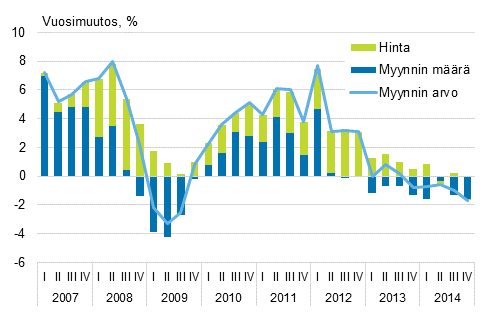 Koko kaupan (TOL G) myynti jatkoi laskuaan myös vuonna 2014, kun liikevaihto supistui 0,7 prosenttia vuodesta 2013. Laskua kertyi kuitenkin vähemmän kuin vuonna 2013, jolloin myynti laski 3,2 prosenttia vuodesta 2012. Myynnin laskeva kehitys on jatkunut yhtäjaksoisesti vuoden 2012 jälkimmäiseltä puoliskolta lähtien. Ennen nykyistä laskukautta myynti supistui viimeksi vuonna 2009, mutta tuolloin lasku jäi noin vuoden mittaiseksi.Koko kaupan myynnin kehitys vuosineljänneksittäin 2007–2014, %