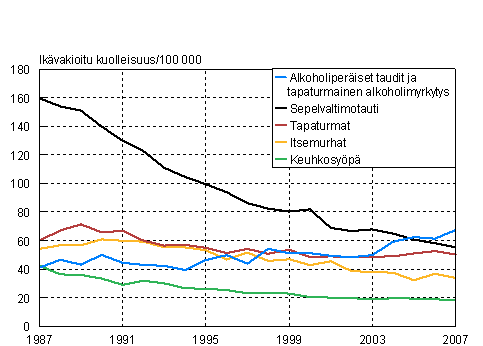 Työikäisten miesten yleisimpien kuolemansyiden kehitys 1987-2007