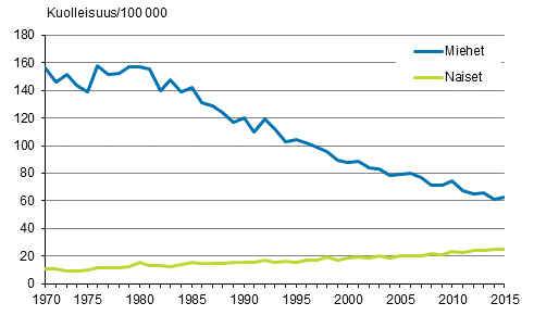 Vuonna 2015 kuolemansyiden pääryhmistä suomalaisia kuoli eniten verenkiertoelinten sairauksiin. Ryhmän merkitys kuolemansyynä on kuitenkin pienentynyt kahdessakymmenessä vuodessa 44 prosentista 37 prosenttiin. Samanaikaisesti miesten ja naisten ikävakioitu kuolleisuus verenkiertoelinten sairauksiin on vähentynyt yli 40 prosenttia (liitekuvio 1).