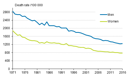 Age-standardised mortality grew in 2016 by 0.7 per cent year-on-year, remaining, however, below the level of 2014. In 2016, men’s age-standardised mortality grew by 1.4 per cent and women’s by 0.1 per cent from 2015. Men’s and women's age-standardised mortality has decreased relatively evenly since the 1970s (Figure 1). A slight increase in total mortality for men occurred last in 2009 and in 1998. For women, mortality has grown in the 2000s, for example, in 2002, 2012 and 2014. In addition to the population, the age-standardised mortality rate takes into account the changes in the population's age structure. The standardisation is necessary so that changes in mortality not due to the ageing of the population structure can be highlighted.