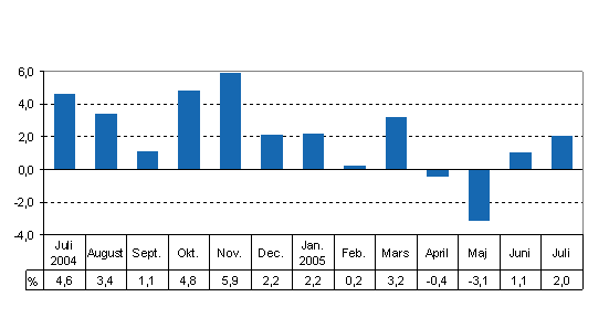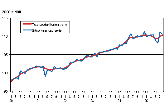 I augusti 2005 ökade volymen av totalproduktionen med 2,0 procent jämfört med augusti året innan. Bara industrin sjönk av de sex huvudnäringarna i månadsgrafen. I augusti 2005 fanns det en arbetsdag mer än motsvarande månad föregående år.