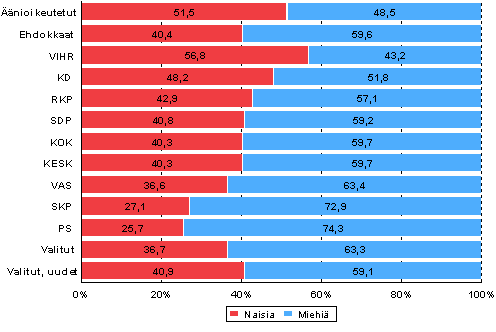 Äänioikeutetuista on enemmistö eli 51,5 prosenttia naisia. Ehdokkaista naisia on 40,4 prosenttia. Naisehdokkaiden osuus on kasvanut edellisvaaleihin verrattuna puolella prosenttiyksiköllä. Vain Vihreällä liitolla on ehdokkaissaan naisenemmistö 56,8 %. Seuraavaksi lähimpänä tasapainoa ovat Kristillisdemokraatit, joilla naisten osuus on 48,2 %. Kokoomuksella, Suomen Keskustalla ja SDP:llä kaikilla on naisten osuus noin 40 prosenttia. Prosentuaalisesti eniten naisehdokkaita on Uudenmaan maakunnassa, 43,9 %, ja vähiten Pohjois-Karjalassa 37,1 %.