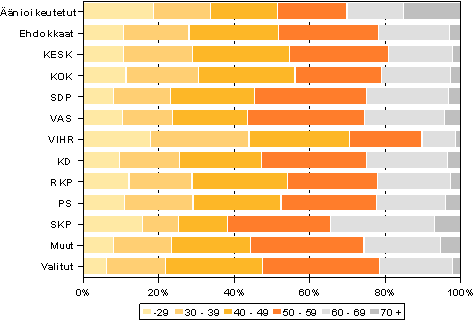 Miehillä painopiste on ikäluokassa 50-59 ja naisilla ikäluokassa 40-49. SDP:llä ja Vasemmistoliitolla on vanhimmat miesehdokkaat eli keski-ikä on 51 vuotta. Vanhimmat naisehdokkaat ovat SKP:llä tasan 50 vuotta ja Kristillisdemokraateilla 48,7 vuotta. Nuorimmat mies- ja naisehdokkaat ovat Vihreällä liitolla 43,1 ja 41,5 vuotta. Kokoomuksen miesten keski-ikä on 47,8 ja naisten 45,1 vuotta, Suomen Keskustan miesten 48,5 ja naisten 44,8 vuotta.