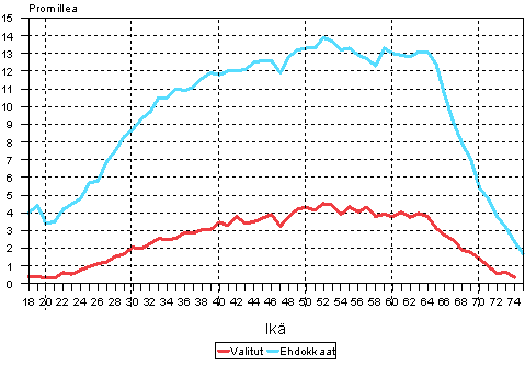 Ehdokkaiden ja valittujen osuus ikäluokasta kunnallisvaaleissa 2008, promilleina