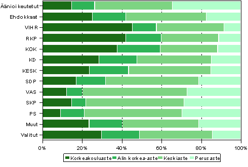Saman tutkinnon suorittaneiden ehdokkaiden osuus on suurin Vihreällä liitolla, 45 prosenttia, RKP:llä 42 %, Kokoomuksella 38 %, Kristillisdemokraateilla 29 % ja Suomen Keskustalla 24 prosenttia.