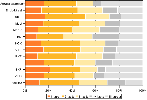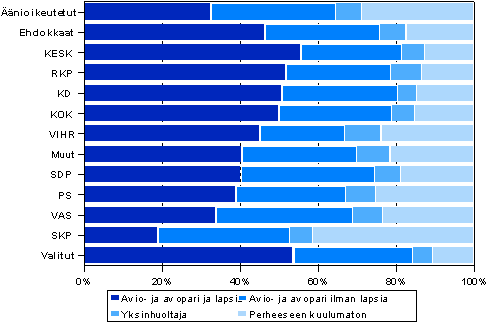 Äänioikeutetuista 32 prosenttia elää samassa taloudessa avio- tai avopuolison ja lasten kanssa. Ehdokkaista tällaisessa perheessä elää 46 prosenttia. Tämän lisäksi 30 prosenttia ehdokkaista elää kahdestaan avio- tai avopuolisonsa kanssa, ilman lapsia. Aviopariperheissä elävien ehdokkaiden osuus on 63 % ja avopareina elävien osuus 13 prosenttia. Äänioikeutetuista on aviopareja 50 % ja avopareja 15 prosenttia. Ehdokkaista yksinhuoltajia on 6,7 prosenttia ja yksineläjiä eli perheisiin kuulumattomia 17,4 prosenttia, mikä on kolme prosenttiyksikköä enemmän kuin edellisissä vaaleissa. Äänioikeutetuista 29 prosenttia elää yhden hengen talouksissa eli heitä on yhtä paljon kuin lapsiperheissä eläviä. Useimmissa puolueissa yksineläjien osuus on kasvanut, Vihreän liiton ehdokkaista neljännes on yksineläjä.