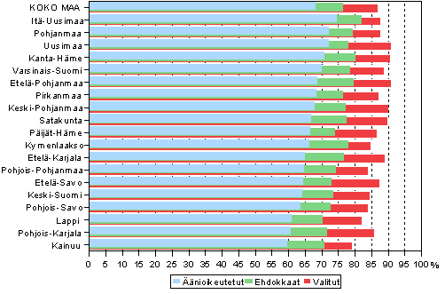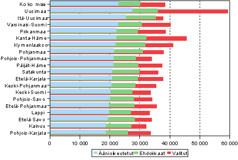 | Maakunta | Äänioikeutetut | Ehdokkaat | Valitut | ||||||