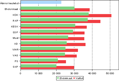 | Äänioikeutetut | Ehdokkaat | KESK | KOK | SDP | VAS | VIHR | KD | RKP | PS | SKP | Muu | |
