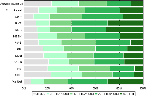 Ehdokkaat ansaitsevat keskimääräistä paremmin ja siksi heistä suurempi osa kuuluu myös ylimpiin tuloluokkiin. Äänioikeutetuista lähes puolet jää alle 17 000 euron vuosituloihin. Ehdokkaista tähän luokkaan kuuluu vain 27 prosenttia. Kahteen alimpaan luokkaan kuuluu suurten puolueiden ehdokkaista hiukan yli viidennes. Perussuomalaisten ja SKP:n ehdokkaiden tulojakauma on lähinnä äänioikeutettujen keskimääräistä jakaumaa. Ylimmässä tuloluokassa eli yli 42 000 euron vuosituloja saavia on Kokoomuksella 31 %, RKP:llä 30 % ja Suomen Keskustalla 20 prosenttia. Äänioikeutetuista tähän luokkaan kuuluu 10 prosenttia. Keskituloisia (tuloluokka 27 000-41 999) on eniten SDP:ssä, 34 prosenttia.