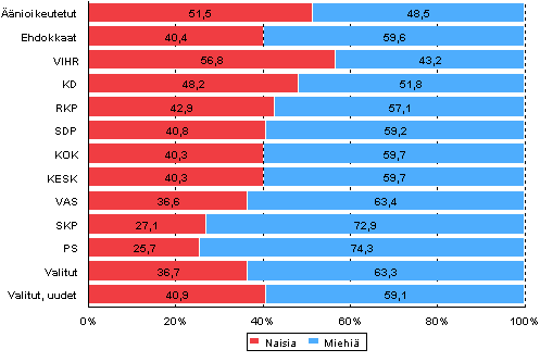 Äänioikeutetuista on enemmistö eli 51,5 prosenttia naisia. Ehdokkaista naisia on 40,4 prosenttia. Naisehdokkaiden osuus on kasvanut edellisvaaleihin verrattuna puolella prosenttiyksiköllä. Vain Vihreällä liitolla on ehdokkaissaan naisenemmistö 56,8 %. Seuraavaksi lähimpänä tasapainoa ovat Kristillisdemokraatit, joilla naisten osuus on 48,2 %. Kokoomuksella, Suomen Keskustalla ja SDP:llä kaikilla on naisten osuus noin 40 prosenttia. Prosentuaalisesti eniten naisehdokkaita on Uudenmaan maakunnassa, 43,9 %, ja vähiten Pohjois-Karjalassa 37,1 %.